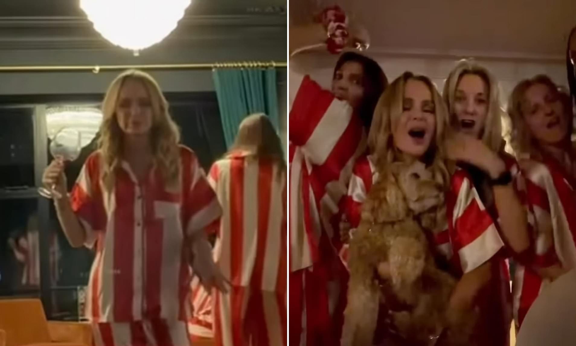 All clad in matching striped Their Nibs pyjamas, the gang let their hair down on their annual festive get-together, dancing up a storm while sipping on red wine.