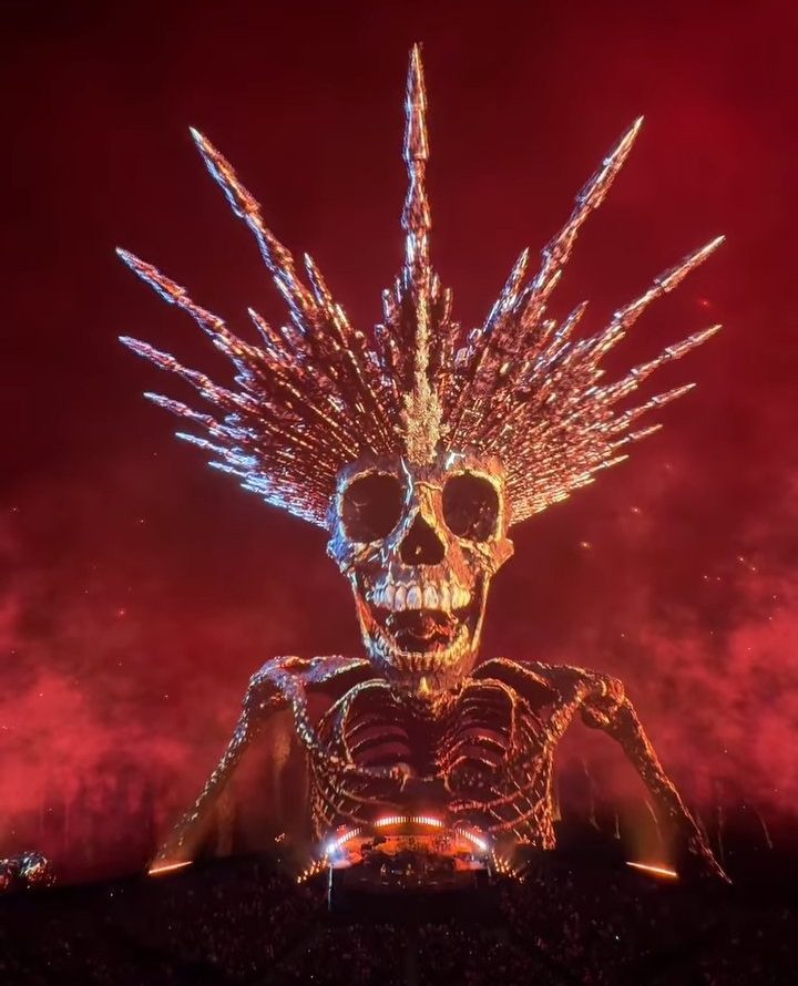 At one point in his show, a huge skeleton adorned with a crown appeared as flames engulfed the bottom of the 160,000-square-foot LED screen.